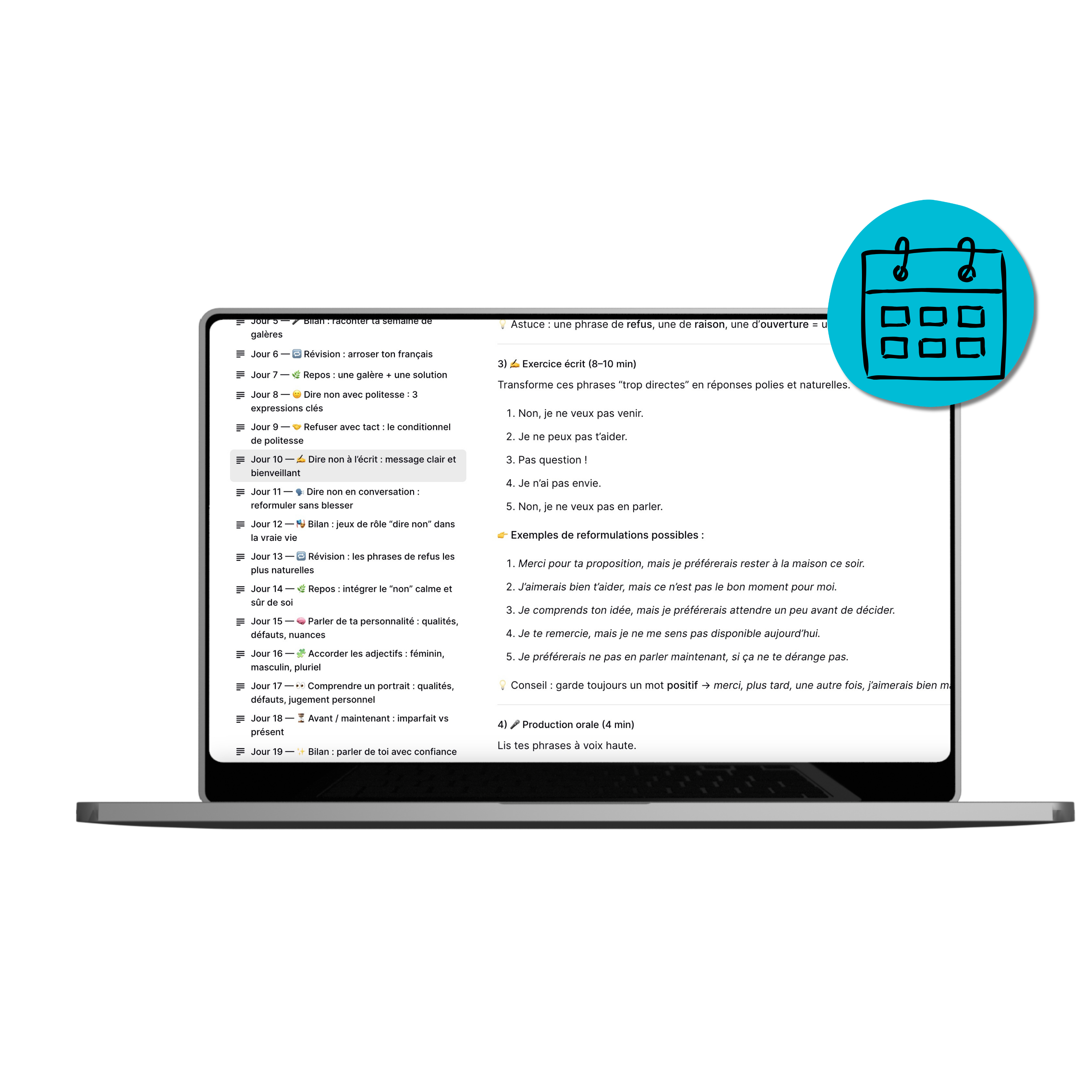 Chaque semaine, tu travailles un sujet concret (émotions, causes, passé, narration…) avec un rythme précis :