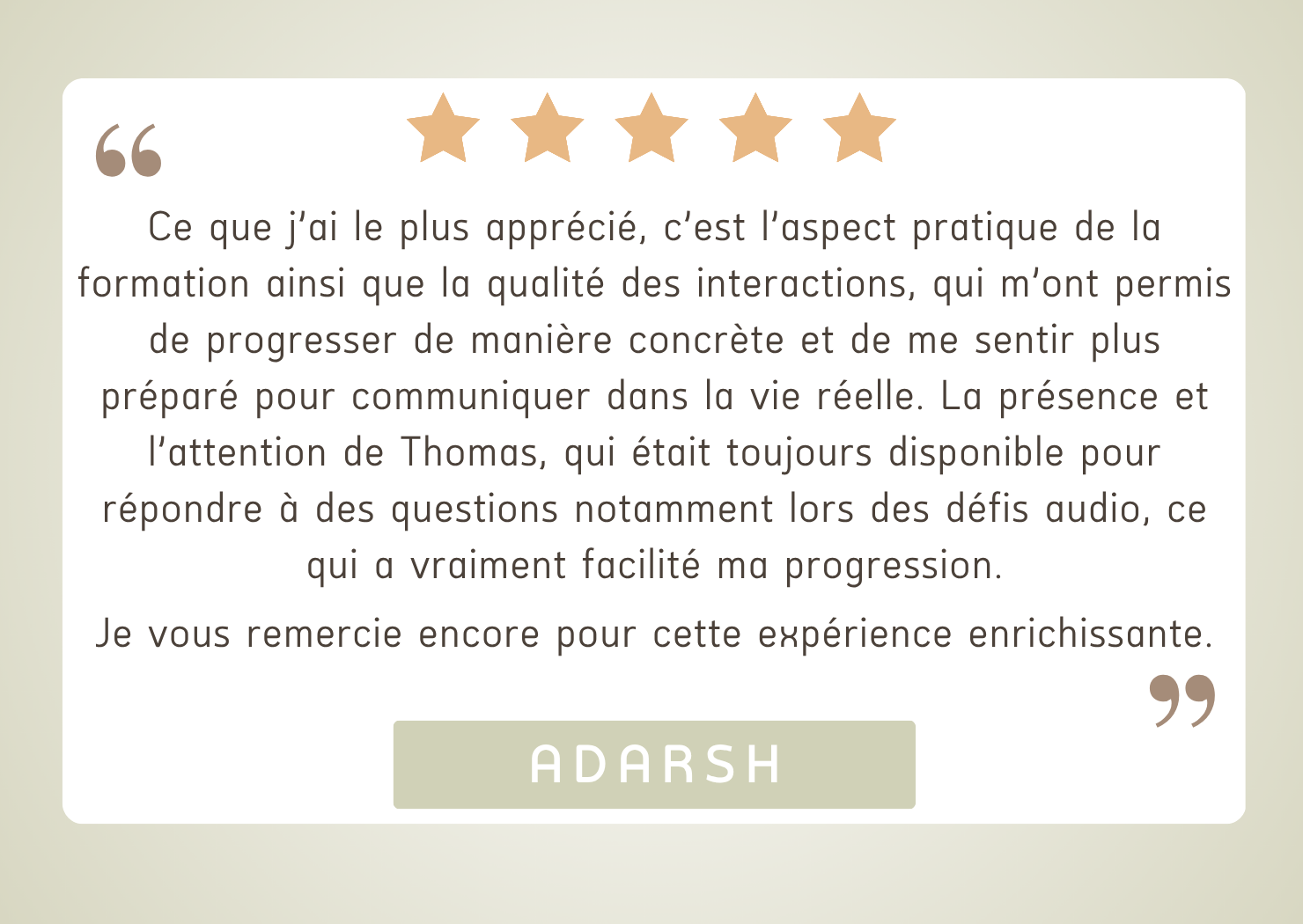 Parce que je sais ce que vivent les apprenants : je vois leurs blocages chaque semaine, leurs hésitations, leurs moments de doute… et je vois aussi leurs déclics, ce moment précis où tout devient plus simple. Parler sans bloquer n’est pas un talent. C’est une méthode. Et c’est exactement ce que je te propose ici.