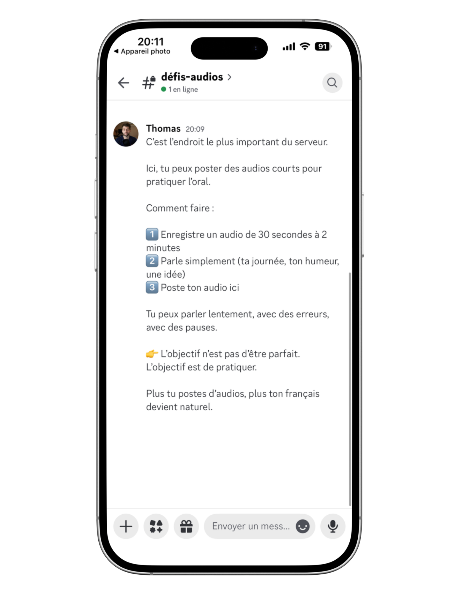 ✏️ Groupe privé d’entraînement oral où tu peux poster tes audios, poser tes questions et voir concrètement ta progression.